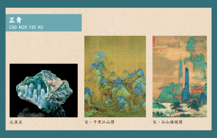 在中国的正色系统当中,青,表东方色。古时青色含义较为复杂,可当作绿、蓝、黑色使用,提取原料也从早期的蓝草、青金石、孔雀石、石青矿、蓝铜矿发展到明代进口的苏麻离青。青作为北宋之精魂,以青绿山水发扬光大。